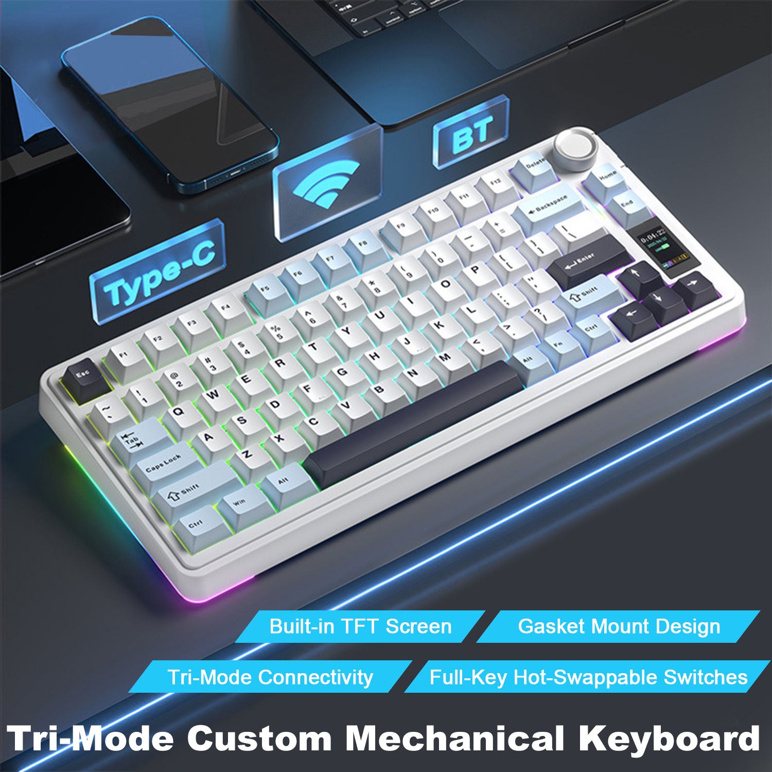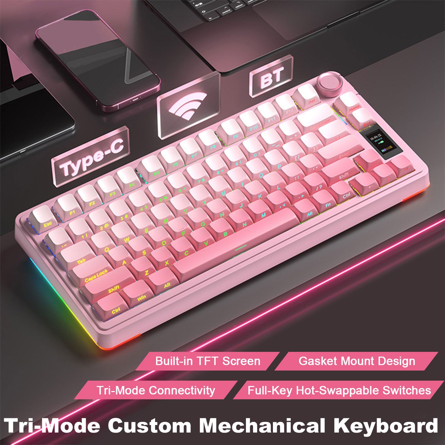 Premium Gradient Keycaps: Features stunning gradient-colored, side-printed PBT keycaps that resist fading and provide a sleek appearance