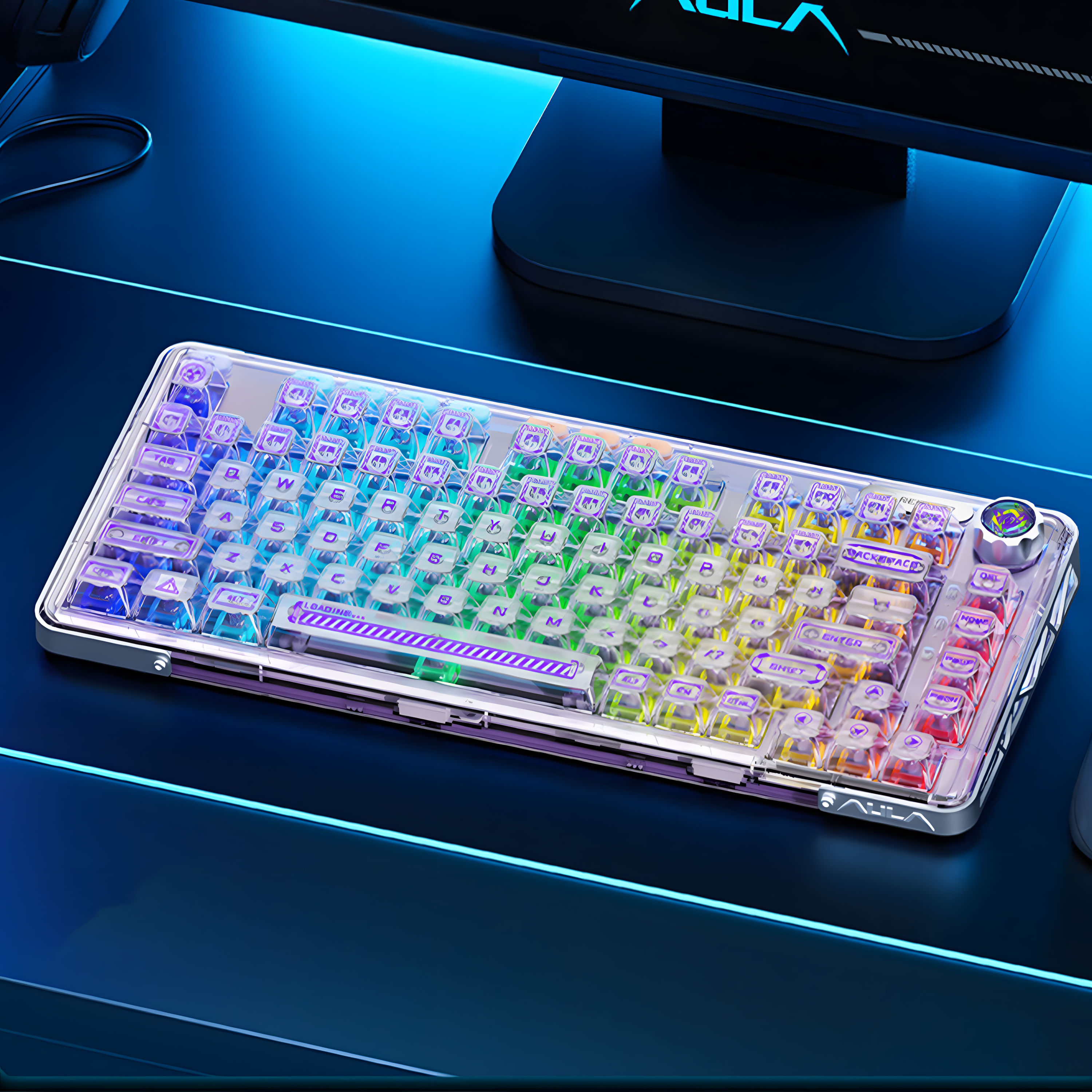 Crystal Clear Performance. The AULA F81 features a stunning transparent design that showcases its internal components and vibrant RGB lighting. This 75% compact keyboard offers wireless freedom with tri-mode connectivity, hot-swappable switches, and a gasket mount structure for superior typing comfort.