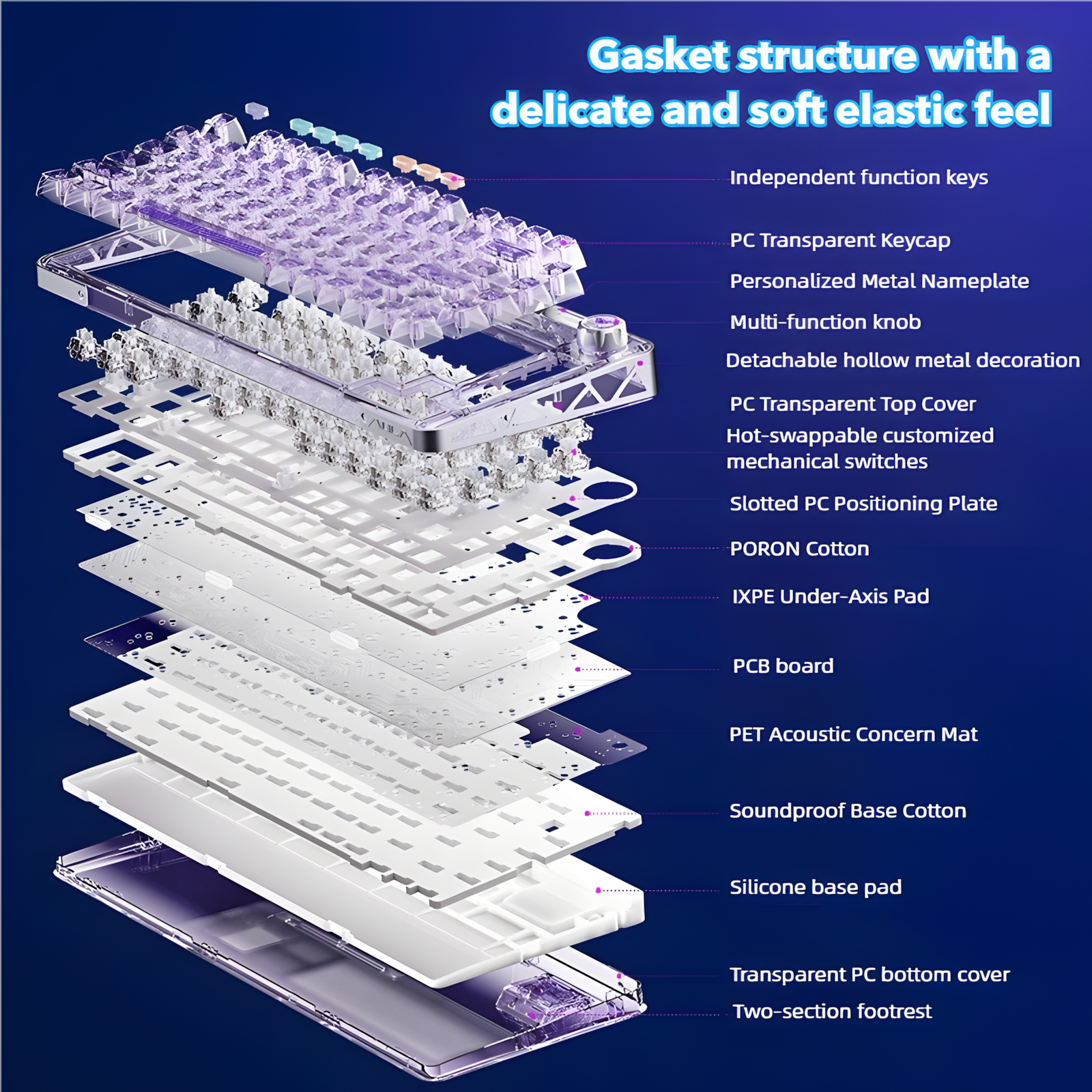 • Gasket Mount Structure: Provides soft, bouncy typing experience with sound dampening