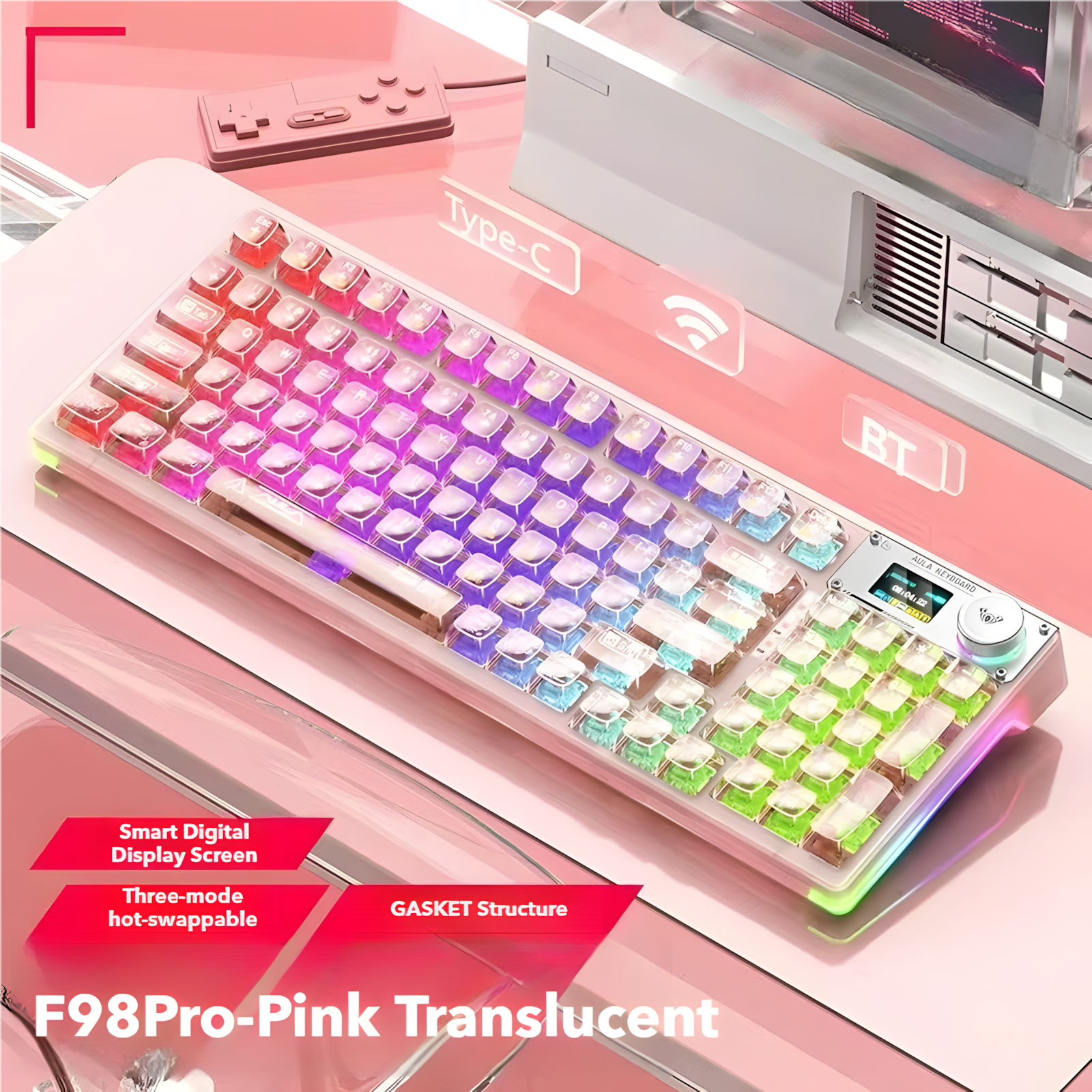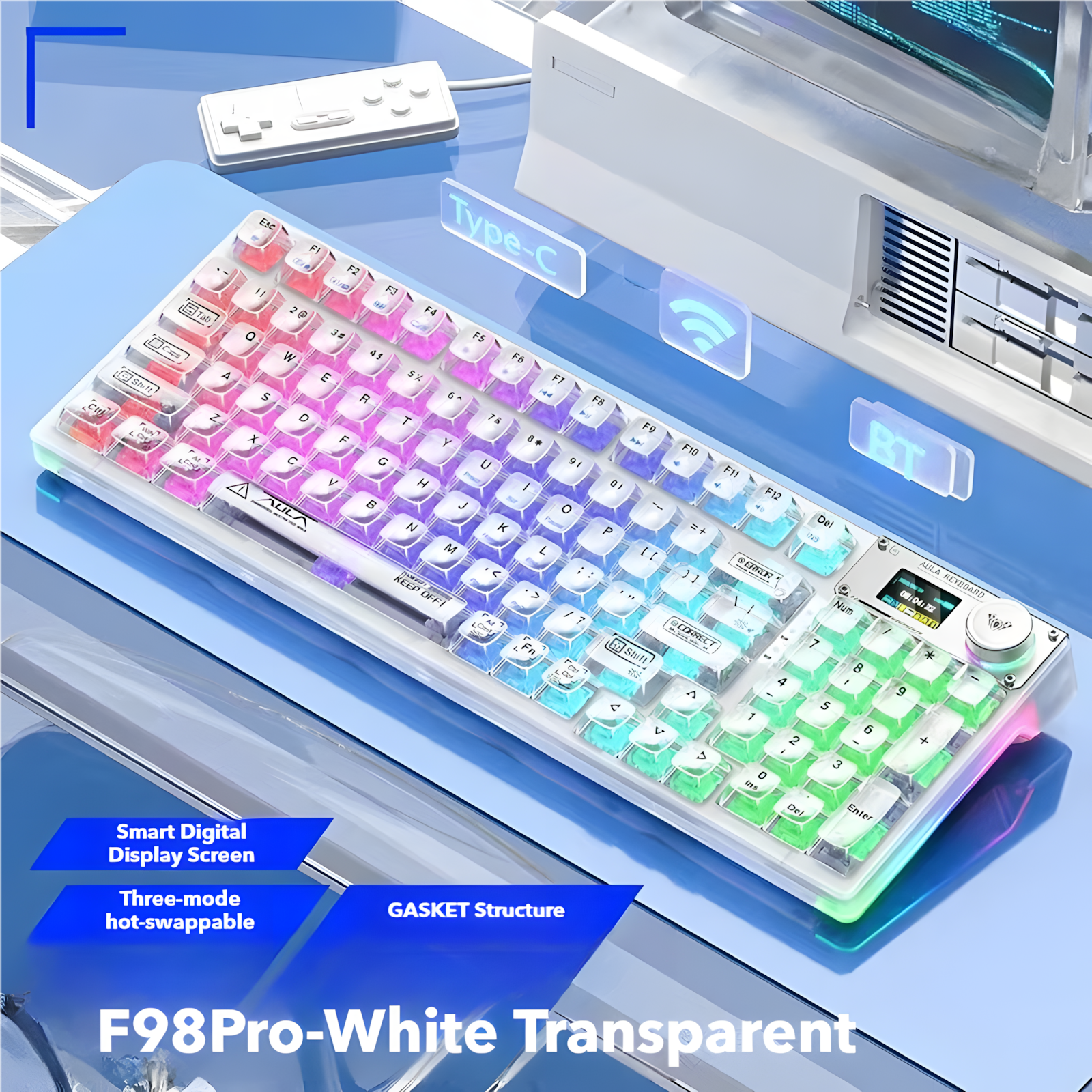 The Ultimate Typing Evolution. The AULA F98 Pro redefines premium mechanical keyboards with its innovative smart display, sleek side-printed keycaps, and advanced gasket mount structure. This 98% layout keyboard combines cutting-edge technology with sophisticated aesthetics for professionals and enthusiasts seeking unparalleled performance.